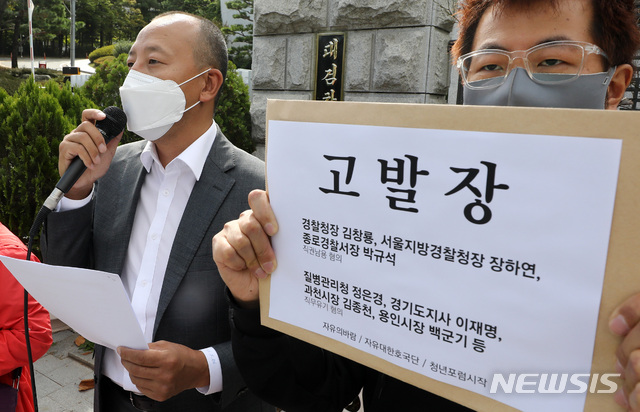 [서울=뉴시스] 이영환 기자 = 오상종 자유대한호국단장 등이 7일 오후 서울 서초구 대검찰청 앞에서 정은경 질병관리청장, 이재명 경기도지사 및 김창룡 경찰청장등에 대한 고발 기자회견을 하고 있다. 2020.10.07.