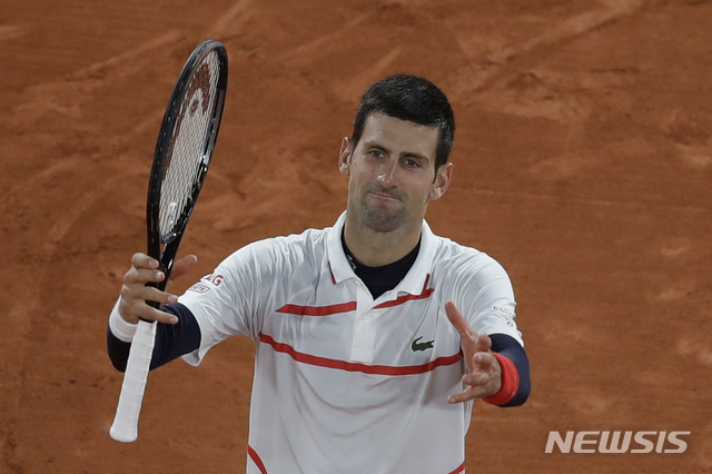 [파리=AP/뉴시스]노바크 조코비치(1위·세르비아)가 7일(현지시간) 프랑스 파리의 롤랑 가로스 경기장에서 열린 프랑스 오픈 테니스 대회 남자 단식 8강전에서 파블로 카레뇨 부스타(18위·스페인)를 물리치고 기뻐하고 있다. 조코비치는 부스타를 세트스코어 3-1(4-6, 6-2, 6-3, 6-4)로 꺾고 준결승에 올랐다. 이로써 프랑스 오픈 4강은 라파엘 나달(2위·스페인)-디에고 슈와르츠만(14위·아르헨티나), 조코비치-스테파노스 치치파스(6위·그리스)로 결정됐다. 2020.10.08.