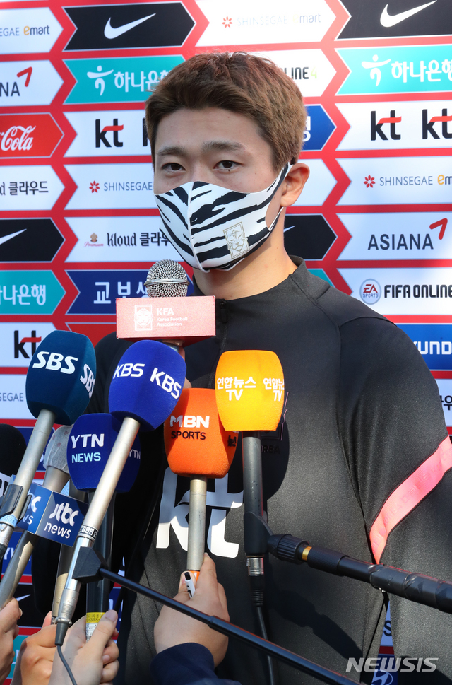 [파주=뉴시스]배훈식 기자 = 축구 국가대표팀과의 친선 경기를 앞둔 올림픽 대표팀 조규성이 8일 오후 경기 파주시 파주NFC에서 취재진과 인터뷰를 하고 있다. 2020.10.08.
