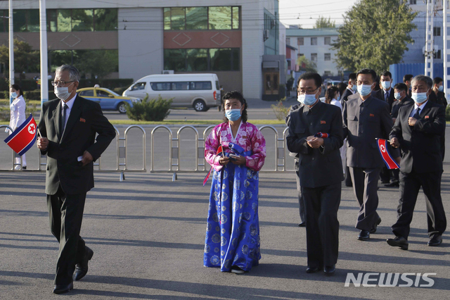 [평양=AP/뉴시스]8일 평양 삼지연 극장에서 조선노동당 창건 75주년을 축하하는 삼지연 관현악단의 공연이 열려 '조선노동당 창건 75돌 경축 대표'들이 공연을 관람하러 극장으로 들어가고 있다. 북한은 10일 조선노동당 창건 75주년을 맞는다. 2020.10.09.
