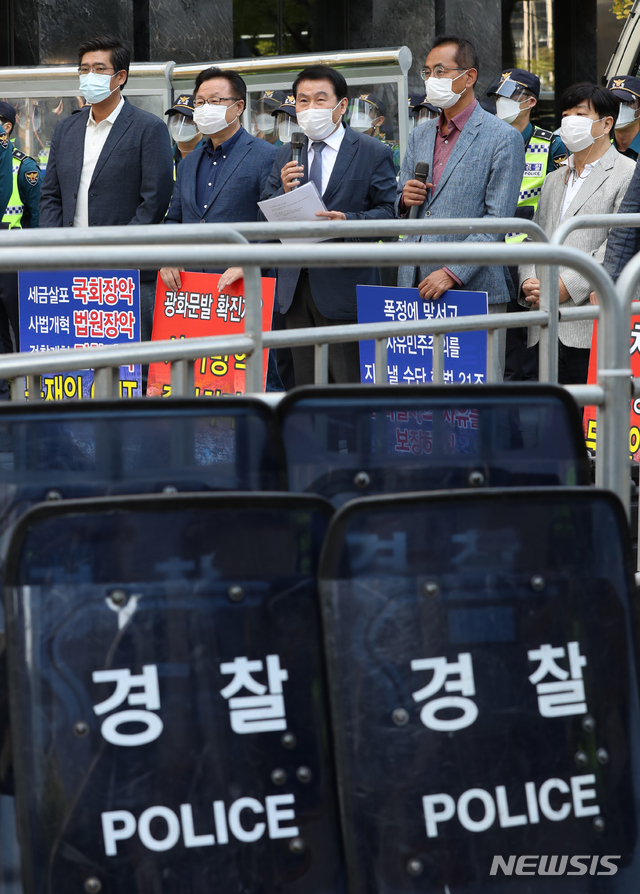 [서울=뉴시스]이윤청 기자 = 최인식 8.15비대위 사무총장을 비롯한 참석자들이 9일 서울 종로구 포시즌스호텔 부근에 설치된 경찰저지선 앞에서 기자회견을 열고 집회결사의 자유 보장 등을 촉구하고 있다. 2020.10.09.
