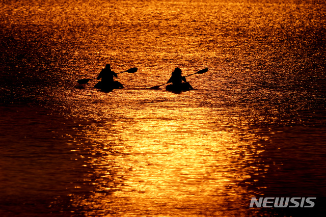 [쇼니=AP/뉴시스]9일(현지시간) 미 캔자스주 쇼니에 있는 쇼니 미션 호수에서 카누를 타는 사람들이 일몰을 즐기며 노를 젓고 있다. 서부 산불의 연기가 전국으로 퍼지면서 일몰은 평소보다 더 극적인 색채를 띠는 것으로 알려졌다. 2020.10.10.