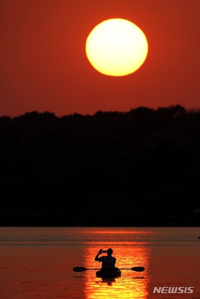 [쇼니=AP/뉴시스]9일(현지시간) 미 캔자스주 쇼니에 있는 쇼니 미션 호수에서 한 남성이 카누를 타며 일몰 사진을 찍고 있다. 서부 산불의 연기가 전국으로 퍼지면서 일몰은 평소보다 더 극적인 색채를 띠는 것으로 알려졌다. 2020.10.10.