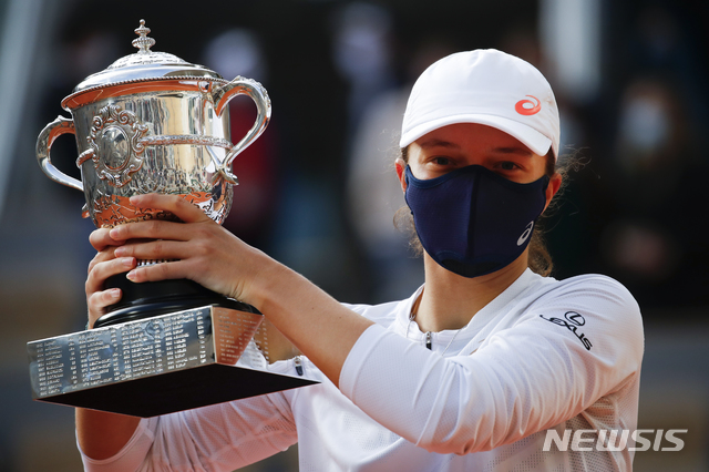 [파리=AP/뉴시스]이가 슈비온텍(54위·폴란드)이 10일(현지시간) 프랑스 파리의 스타드 롤랑가로스에서 열린 프랑스 오픈 여자 단식에서 우승, 트로피를 들고 포즈를 취하고 있다. 슈비온텍은 결승전에서 올해 호주오픈 우승자인 소피아 케닌(6위·미국)을 세트 스코어 2-0(6-4, 6-1)으로 꺾고 폴란드 선수 최초로 프랑스 오픈에서 우승했다. 올해 19세인 슈비온텍은 자신의 여자프로테니스(WTA) 투어 첫 우승을 메이저 대회 우승으로 장식하는 기염을 토했다. 2020.10.11.