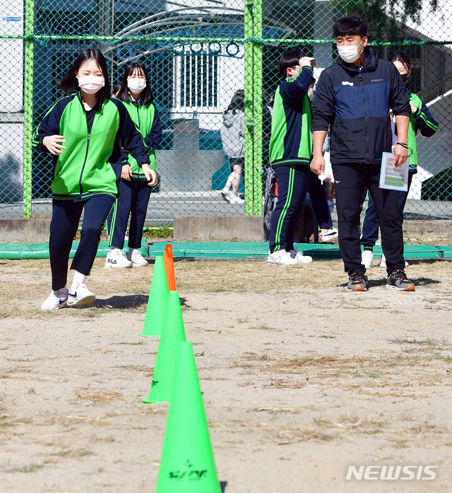 [광주=뉴시스] 류형근 기자 = 15일 오전 광주 북구 경신중학교 운동장에서 북구체력인증센터의 '찾아가는 체력 인증의 날 행사'가 열린 가운데 중학생들이 지그재그 달리기를 하고 있다. 2020.10.15.