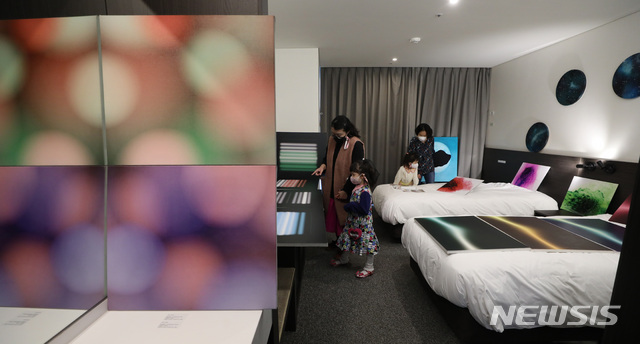 [서울=뉴시스] 조수정 기자 = 2020 인사동 문화축제 X 아시아 호텔 아트페어 서울 2020이 열린 16일 오후 서울 나인트리 프리미어호텔 인사동에서 관람객들이 호텔 침실에 전시된 작품을 보고 있다. 2020.10.16.