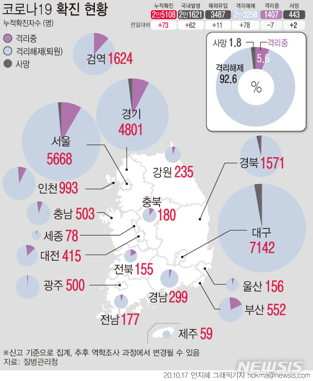 [서울=뉴시스]17일 질병관리청에 따르면 이날 0시 기준 누적 확진자는 73명 늘어난 2만5108명이다. 격리 치료 중인 환자는 7명이 줄어 1407명으로 집계됐다. 사망자는 2명이 늘어 443명이다. (그래픽=안지혜 기자)