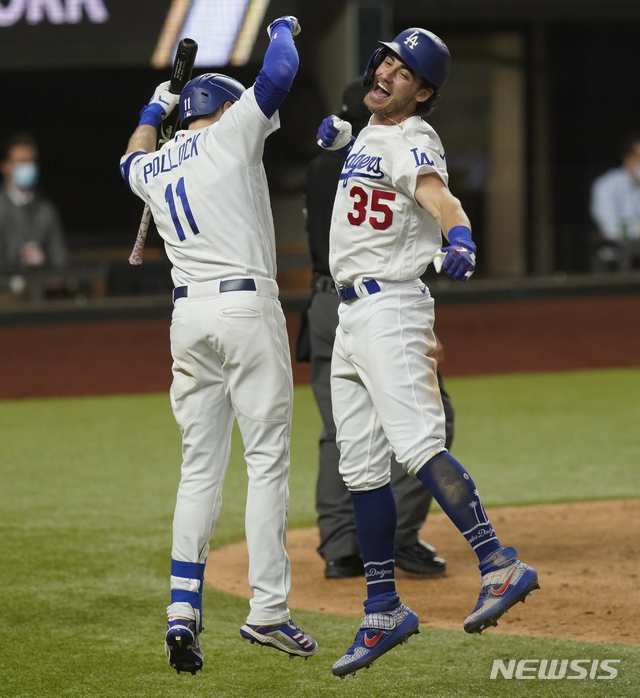 [알링턴=AP/뉴시스]LA 다저스 코디 벨린저(오른쪽)가 18일(현지시간) 미 텍사스주 알링턴의 글로브 라이프 필드에서 열린 내셔널리그 챔피언십시리즈(NLCS) 7차전 애틀랜타 브레이브스와의 경기 7회 말 결승 1점 홈런을 치고 들어와 A.J. 폴락과 환호하고 있다. 다저스는 벨린저의 결승 홈런으로 애틀랜타에 4-3으로 승리하면서 시리즈 전적 4승3패로 2020 월드시리즈에 진출해 탬파베이 레이스와 대결을 펼친다. 2020.10.19.