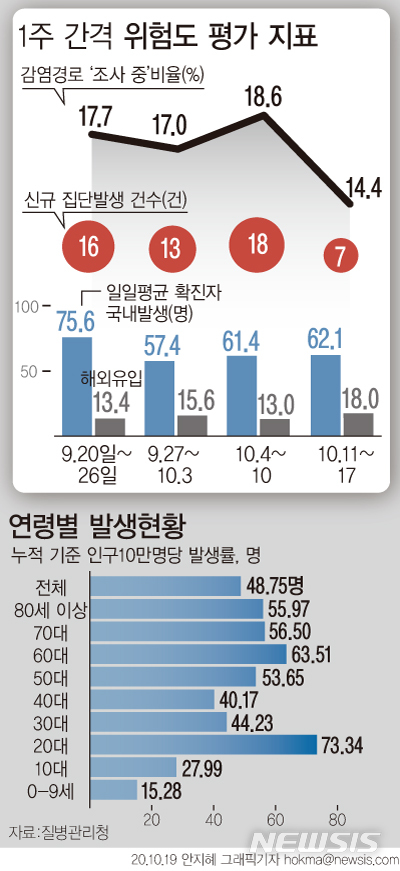 [서울=뉴시스]19일 질병관리청에 따르면 최근 1주간 코로나19 국내발생 일일 평균 확진환자는 62.1명으로 전주 10월4~10일 61.4명보다 소폭 상승했다. 감염경로 미파악자 비율은 14.4%이다. (그래픽=안지혜 기자)