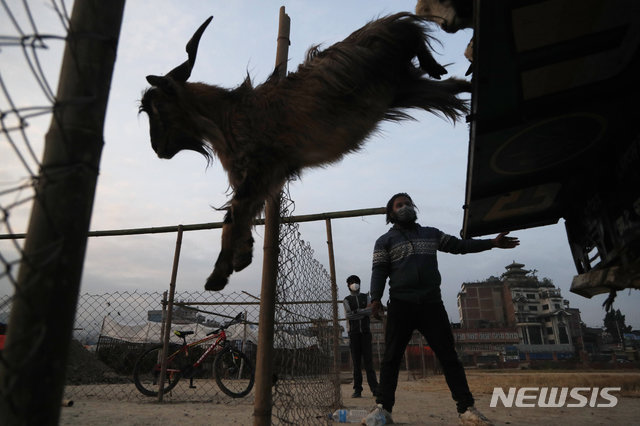[카트만두=AP/뉴시스]19일(현지시간) 네팔 카트만두에서 한 남성이 다샤인 축제 동안 제물로 쓰일 염소를 팔기 위해 차량에서 내리고 있다. 네팔 힌두교의 종교 축제인 다샤인은 악으로부터 인간을 구원한 힌두교 여신 두르가(Durga)를 숭배하고 찬양하는 축제다. 2020.10.19.