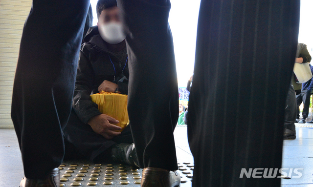 [광주=뉴시스] 변재훈 기자 = 지난 8월 집중호우 당시 추모관 안장 유골함 침수 피해를 입은 한 유족이 23일 오후 광주 북구 용봉동 북구청 앞에서 피해 보상 등 대책 마련과 적극적인 중재를 요구하며 연좌 농성을 하고 있다. 2020.10.23.