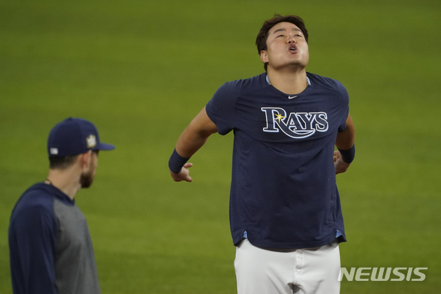 [알링턴=AP/뉴시스]탬파베이 레이스 1루수 최지만이 23일(현지시간) 미 텍사스주 알링턴의 글로브 라이프 필드에서 LA 다저스와의 2020 MLB 월드시리즈 3차전을 앞두고 몸을 풀고 있다. 최지만은 2차전에 선발 출전해 3타수 1안타 2득점하며 팀의 6-4 승리에 이바지했다. 2020.10.24.
