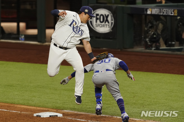 [알링턴=AP/뉴시스]탬파베이 레이스 1루수 최지만이 23일(현지시간) 미 텍사스주 알링턴의 글로브 라이프 필드에서 열린 LA 다저스와의 2020 MLB 월드시리즈 3차전 8회 초 수비하면서 무키 베츠를 태그 아웃시키고 있다. 2020.10.24.