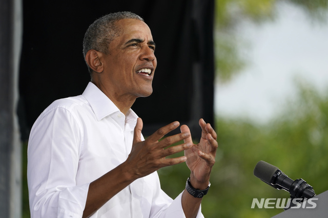 [마이애미=AP/뉴시스]버락 오바마 전 미국 대통령이 24일(현지시간) 미 플로리다주 마이애미의 플로리다 국제대학에서 조 바이든 민주당 대선 후보 지원 유세를 하고 있다. 오바마는 "한국의 인구당 코로나19 사망자가 미국의 1.3%에 불과한 것은 한국 정부가 자신의 업무에 신경 썼기 때문"이라며 트럼프 대통령을 비판했다. 미 CNN은 인구 100명당 코로나19 사망자가 미국이 679.06명인데 반해 한국은 8.81명이라고 발표했다. 2020.10.25.