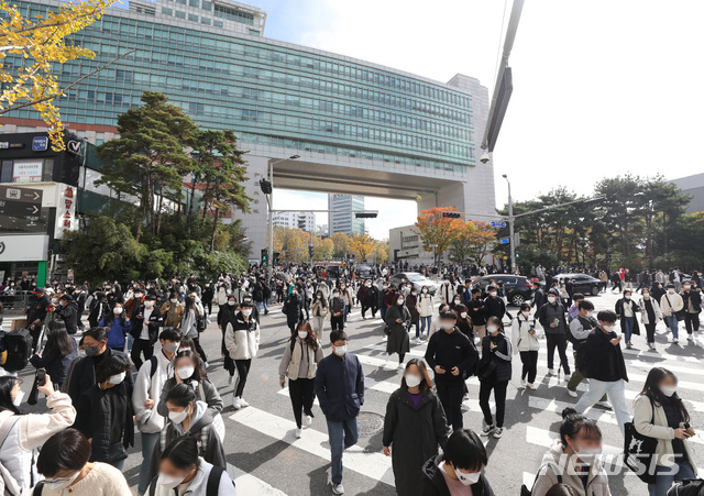[서울=뉴시스] 박미소 기자 = 홍익대학교 논술고사가 실시된 25일 오후 서울 마포구 홍익대학교 서울캠퍼스에서 시험을 마친 학생들이 고사장을 빠져나오고 있다. 2020.10.25.