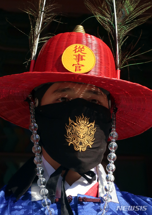 【서울=뉴시스】 박태홍 기자 = 코로나19 여파로 잠정 중단했던 경복궁 수문장 교대 의식이 8개월여 만에 재개된 24일서울 종로구 경복궁 근정문에서 종사관(從事官)이 도깨비 문양이 새겨진 마스크를 하고 서 있어 코로나바이러스를 막아줄 것만 같다. 2020.10.25