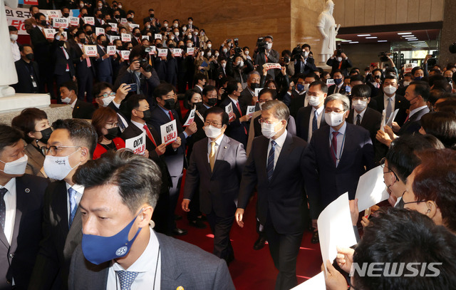 피켓시위하는 국민의힘 의원 사이 지나는 문재인 대통령