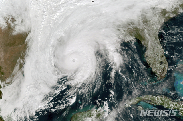 [뉴올리언스=AP/뉴시스]NOAA가 제공한 28일(현지시간) 오후 1시에 찍은 지오컬러 위성사진에 미 루이지애나주로 접근한 허리케인 제타의 모습이 보인다. 루이지애나주의 뉴올리언스 일대가 제타의 진로 한가운데 들면서 수많은 주택과 상가가 폭우와 강풍에 무너지고 수천 세대가 정전 피해 등을 겪고 있다. 2020.10.29.