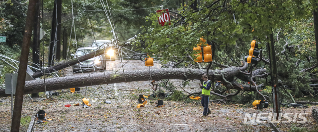 [애틀란타=AP/뉴시스]29일(현지시간) 미 조지아주 애틀랜타의 웨스트 웨슬리 도로와 하버샴 도로를 가로질러 큰 나무 한 그루가 쓰러져 있다. 허리케인 제타가 조지아주 북부를 지나면서 전력 공급이 끊겨 100만 명 가까운 주민들이 불편을 겪었다. 2020.10.30.
