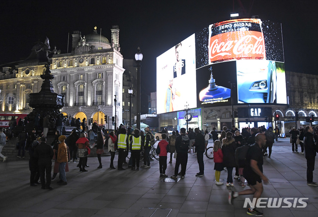 [런던=AP/뉴시스]10월 31일(현지시간) 영국 런던의 피카딜리 서커스 광장에 시민들이 모여 있다. 앞서 보리스 존슨 총리는 코로나19 재확산 속도가 빨라지면서 이에 대응하기 위해 11월 5일부터 4주간 봉쇄 조처를  내린다고 발표했다. 영국의 코로나19 누적 확진자 수가 100만 명을 넘어 101만1660명, 사망자는 4만6555명으로 집계됐다. 2020.11.01.