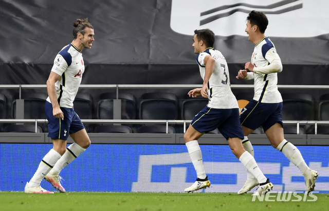 [런던=AP/뉴시스]토트넘 손흥민(오른쪽)이 1일(현지시간) 영국 런던의 토트넘 홋스퍼 스타디움에서 열린 2020-21시즌 잉글리쉬 프리미어리그(EPL) 7라운드 브라이튼 앤 호브 알비온과의 경기에 선발 출전해 후반 28분 팀의 두 번째 골을 넣은 개러스 베일을 축하하고 있다. 85분을 소화한 손흥민은 공격 포인트를 올리지 못했고 토트넘은 베일의 결승 골로 2-1 승리를 거뒀다. 2020.11.02.