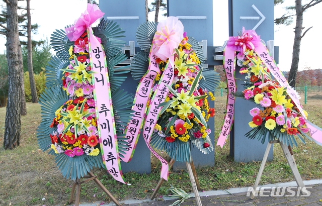 [진천=뉴시스]강신욱 기자 = 3일 오후 윤석열 검찰총장이 신임 부장검사들을 대상으로 교육하기 위해 방문하는 충북 진천군 법무연수원 입구에는 윤석열(포청천)밴드회원 일동으로 윤석열 총장과 한동훈 검사를 응원하고 추미애 법무부장관을 비난하는 화환이 놓여 있다. 2020.11.03.