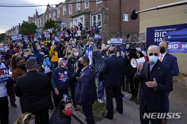 [필라델피아=AP/뉴시스]조 바이든(오른쪽) 미 민주당 대선 후보가 3일(현지시간) 펜실베이니아주 필라델피아에서 확성기를 들고 지지자들에게 연설하고 있다. 펜실베이니아주는 바이든 후보의 고향이며 초경합 주이기도 하다. 2020.11.04.