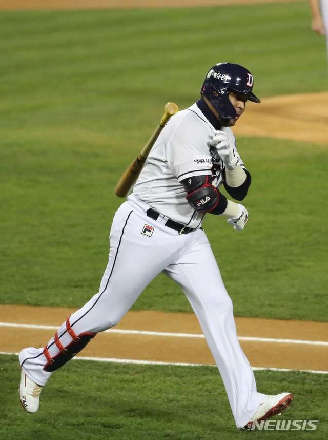 [서울=뉴시스] 고승민 기자 = 4일 서울 잠실야구장에서 열린 2020 KBO 포스트시즌 준PO 1차전 LG트윈스와 두산베어스 경기, 두산 공격 1회말 무사 1루 상황 2번타자 페르난데스가 우익수 뒤 홈런을 치고 1루로 진루하며 배트를 던지고 있다. 2020.11.04.