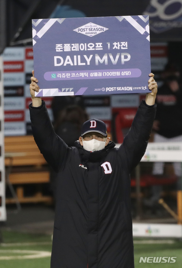 [서울=뉴시스] 고승민 기자 = 4일 서울 잠실야구장에서 열린 2020 KBO 포스트시즌 준PO 1차전 엘지트윈스와 두산베어스 경기, 두산이 4대 0으로 승리한 가운데 MVP를 수상한 선발투수 플렉센이 기념촬영을 하고 있다. 2020.11.04.