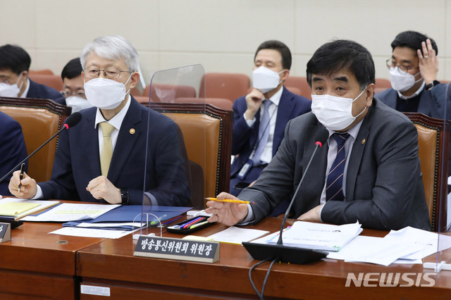[서울=뉴시스]김선웅 기자 = 한상혁 방송통신위원회 위원장이 5일 국회에서 열린 과학기술정보방송통신위원회 전체회의에서 의원 질의에 답하고 있다. (공동취재사진) 2020.11.05.
