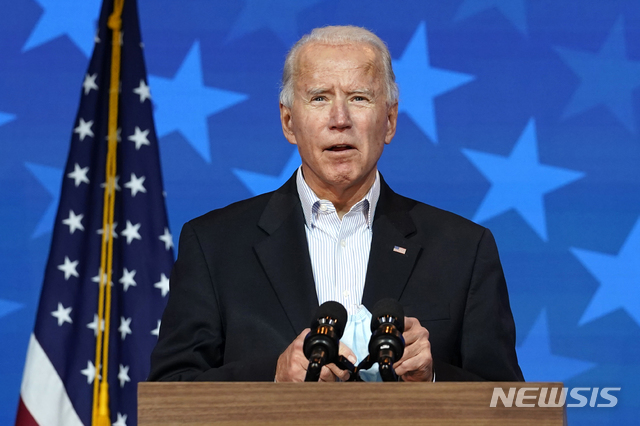 [윌밍턴=AP/뉴시스]조 바이든 민주당 대선 후보가 5일(현지시간) 델라웨어주 윌밍턴에 있는 더 퀸 극장에서 연설하고 있다. 바이든 후보는 "개표가 끝나면 나와 해리스 부통령 후보가 승리할 것"이라며 모두가 침착할 것을 당부했다. 그는 "투표는 신성하며 모든 표가 개표돼야 한다"라고도 말했다.2020.11.06.