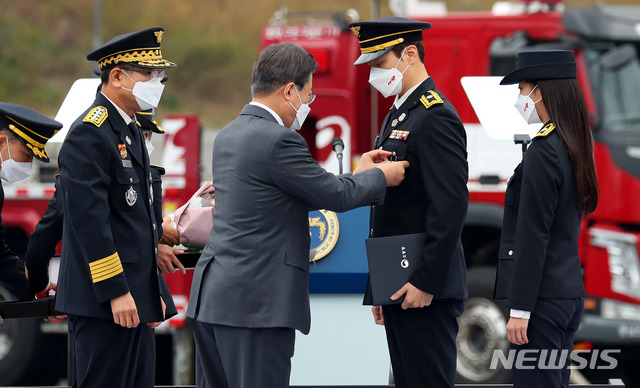 [공주=뉴시스]추상철 기자 =문재인 대통령이 6일 오전 충남 공주시 중앙소방학교에서 열린 '살려서 돌아오라, 살아서 돌아오라'를 주제로 한 '제58주년 소방의 날' 기념식에 참석해 배우 이준혁에게 명예소방관 위촉장을 전달하고 있다. 2020.11.06.