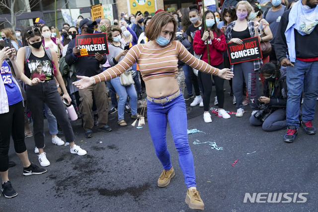 [필라델피아=AP/뉴시스]6일(현지시간) 미 펜실베이니아주 필라델피아의 필라델피아 컨벤션 센터 앞에서 시위대가 개표 결과를 기다리며 모여 있다. 2020.11.07.