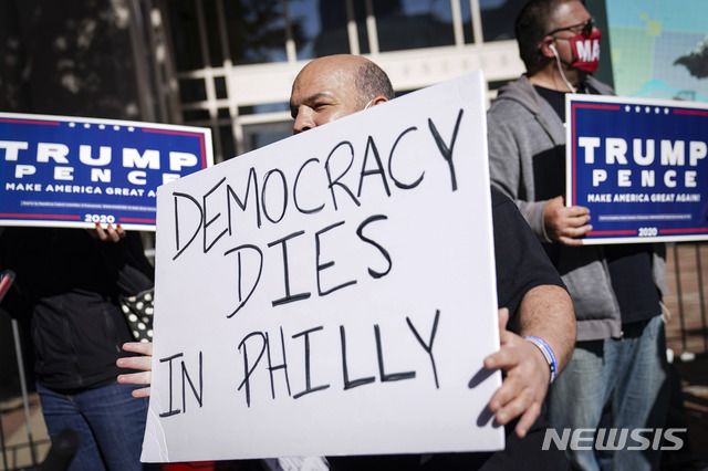 [필라델피아=AP/뉴시스]6일(현지시간) 미 펜실베이니아주 필라델피아의 필라델피아 컨벤션 센터 앞에서 한 트럼프 대통령 지지자가 "필라델피아에서 민주주의는 죽았다"라는 손팻말을 들고 있다. 2020.11.07.