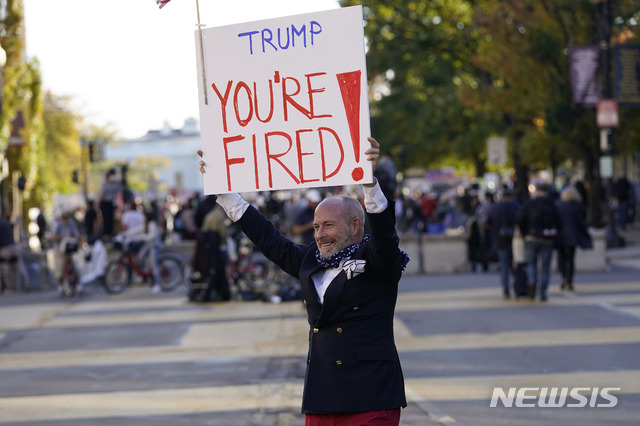 [워싱턴=AP/뉴시스]6일(현지시간) 미 워싱턴 백악관 인근 흑인 생명 소중(BLM) 광장에서 시위대가 모든 표의 개표를 촉구하는 시위를 하는 가운데 한 남성이 "트럼프, 해고"라는 팻말을 들고 있다. 2020.11.07.