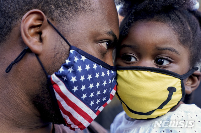 [워싱턴=AP/뉴시스]7일(현지시간) 미 워싱턴에서 한 흑인 남성이 자신의 2세 딸과 함께 조 바이든 후보의 대통령 당선을 축하하고 있다. 바이든 민주당 후보는 경합 주인 펜실베이니아주에서 승리하면서 선거인단 273석을 확보, 도널드 트럼프 대통령을 꺾고 미국의 제46대 대통령이 됐다. 2020.11.08.
