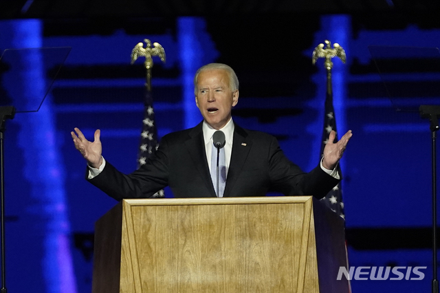 [윌밍턴=AP/뉴시스]조 바이든 대통령 당선인이 7일(현지시간) 미 델라웨어주 윌밍턴에서 대국민 연설을 하고 있다. 바이든 당선인은 "우리는 같은 미국인"이라며 "분열이 아닌 통합 추구하는 대통령이 되겠다"라고 밝혔다. 2020.11.08.