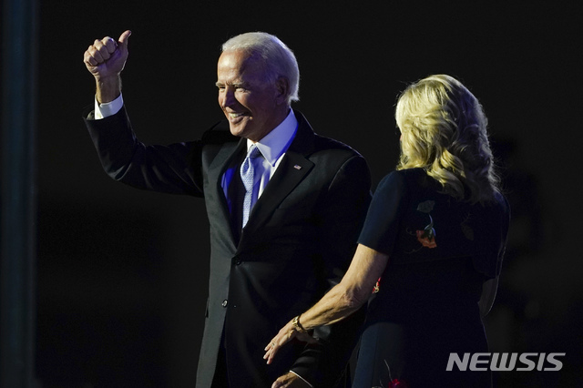 [윌밍턴=AP/뉴시스]조 바이든 대통령 당선인이 7일(현지시간) 미 델라웨어주 윌밍턴에서의 대국민 연설을 마치고 부인 질 바이든과 함께 '엄지 척'을 하고 있다. 2020.11.08.