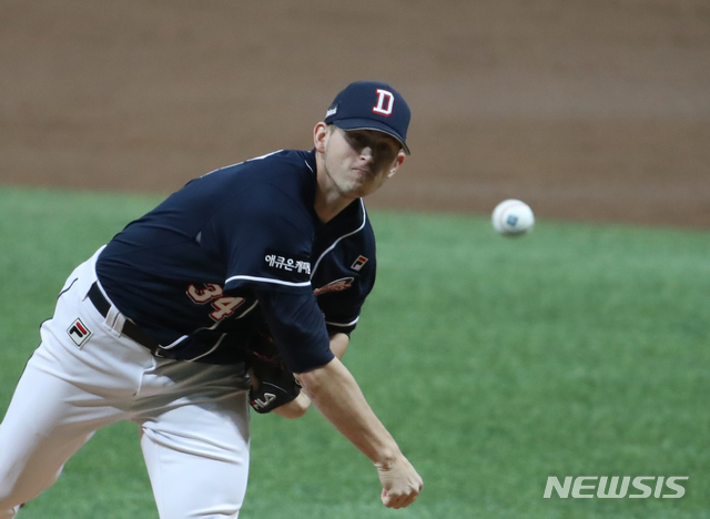 [서울=뉴시스] 조수정 기자 = 9일 오후 서울 구로구 고척스카이돔에서 열리는 '2020 신한은행 SOL KBO 포스트시즌‘ 플레이오프 1차전 두산베어스 대 kt위즈의 경기, 1회말 두산 선발투수 플렉센이 역투하고 있다.  2020.11.09.