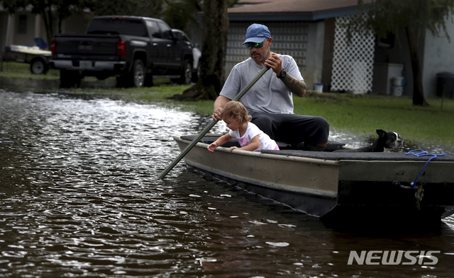 [플랜테이션=AP/뉴시스]열대성 폭풍 '에타'가 미 플로리다 해안으로 북상한 가운데 9일(현지시간) 플로리다주 플랜테이션에서 한 남성이 딸과 함께 보트에 올라 노를 젓고 있다. 폭우를 동반한 에타로 도시 전체에 홍수가 발생해 차량이 전복되고 상가가 침수됐으며 빠르게 불어난 물로 지역 전체가 물에 잠겼다. 2020.11.10.