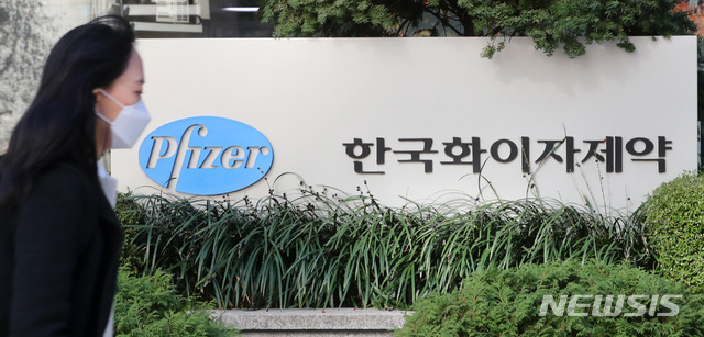 [서울=뉴시스]배훈식 기자 = 미국 제약회사 화이자가 신종 코로나바이러스 감염증(코로나19) 백신 3상 임상에서 90% 효과를 확인했다고 알려진 10일 오전 서울 중구 한국화이자제약 앞을 한 시민이 걸어가고 있다. 2020.11.10.