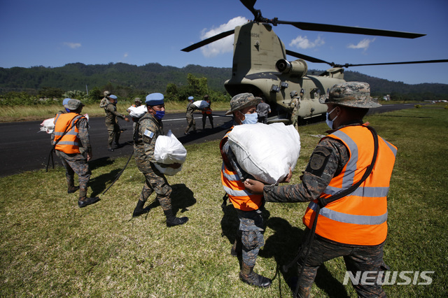 [케하=AP/뉴시스]10일(현지시간) 과테말라 군인들이 과테말라 북부 코반으로 이송될 미군 헬기에 열대성 폭풍 에타 수재민들에 보낼 긴급 구호품을 싣고 있다. 과테말라 정부는 '에타'로 인한 폭우로 지난 5일 산사태가 발생한 케하에 대한 수색 작업을 중단한다고 발표했다. 당국은 케하의 지반이 불안정해 수색을 이어가기 어려워 국제 규정에 따라 중단한다고 밝혔다. 2020.11.11.