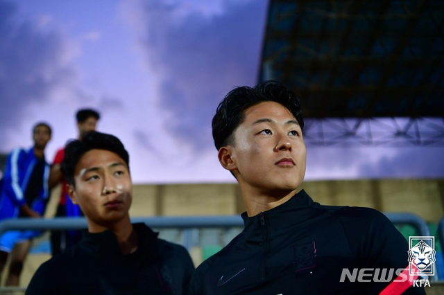 [서울=뉴시스]올림픽축구국가대표팀(U-23) 백승호(왼쪽), 이승우가 10일(현지시간) 이집트 카이로 에어 디펜스 경기장에서 훈련을 하고 있다. (사진=대한축구협회 제공) 2020.11.11.