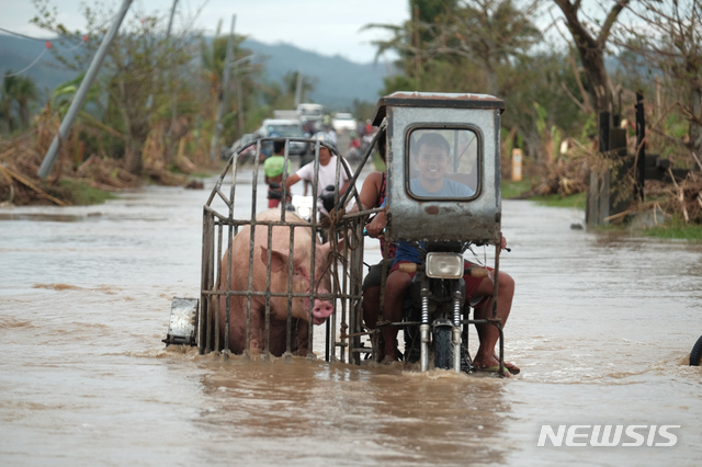 [레가스피=AP/뉴시스]제22호 태풍 '밤꼬'로 필리핀 알바이주에 홍수가 발생해 12일 주민들이 오토바이로 돼지 한 마리를 옮기고 있다. '밤꼬'로 필리핀 동북부 지역의 강물이 불어나 저지대가 침수돼 구조대가 침수 지역의 주민들을 구조하는 등 피해가 잇따랐다. 2020.11.12.