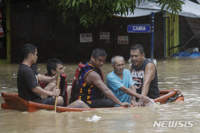[마리키나=AP/뉴시스]제22호 태풍 '밤꼬'로 필리핀 마리키나에 홍수가 발생해 12일 주민들이 고무보트를 타고 침수 지역을 빠져나오고 있다. '밤꼬'로 필리핀 동북부 지역의 강물이 불어나 저지대가 침수돼 구조대가 침수 지역의 주민들을 구조하는 등 피해가 잇따랐다. 2020.11.12.