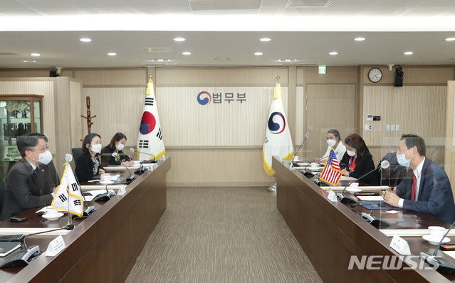 [서울=뉴시스] 고승민 기자 = 고기영 법무부 차관이 12일 법무부에서 모스 탠 미국 국제형사사법대사를 접견하고 있다. (사진=법무부 제공) 2020.11.12.