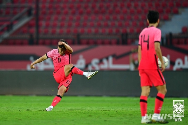 [서울=뉴시스] 조수정 기자 = 13일(현지시간) 이집트 카이로의 알살람 스타디움에서 열린 23세 이하(U-23) 축구대표팀 친선대회 대한민국 브라질과의 경기,  배승호가 프리킥 하고 있다. 결과는 1-3 역전패.  (사진=대한축구협회 제공) 2020.11.15.