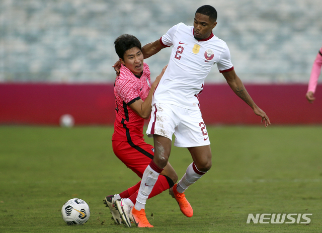 [빈=AP/뉴시스]윤종규(왼쪽)가 17일(현지시간) 오스트리아 빈 인근 마리아 엔처스도르프의 BSFZ 아레나에서 열린 카타르와의 평가전에 선발 출전해 공을 다투고 있다. 한국 대표팀은 전반 황희찬과 황의조의 골로 2-1 승리를 거뒀다. 황희찬은 경기 시작 16초 만에 골을 넣어 한국 축구 역사상 최단 시간 A매치 득점을 기록했다. 2020.11.18.
