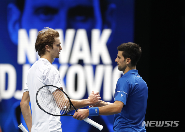 [런던=AP/뉴시스]노바크 조코비치(1위·세르비아, 오른쪽)가 20일(현지시간) 영국 런던의 O2 아레나에서 열린 ATP 월드 파이널 남자 단식 조별 리그 최종전에서 알렉산더 츠베레프(7위·독일)를 물리치고 인사를 나누고 있다. 조코비치는 츠베레프를 세트 스코어 2-0(6-3 7-6<7-4>)으로 꺾고 가장 늦게 준결승에 올라 도미니크 팀(3위·오스트리아)과 결승 진출을 다툰다. 2020.11.21.