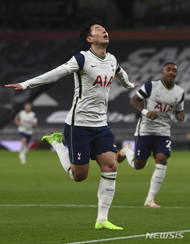[런던=AP/뉴시스]손흥민이 21일(현지시간) 영국 런던의 토트넘 홋스퍼 스타디움에서 열린 2020~21 잉글랜드 프리미어리그(EPL) 9라운드 맨체스터 시티와의 경기에 선발 출전해 경기 시작 5분 만에 선제골을 넣고 기뻐하고 있다. 토트넘은 손흥민의 선제골과 지오바니 로 셀소의 추가 골로 2-0 승리를 거두며 선두에 올랐다. 2020.11.22.